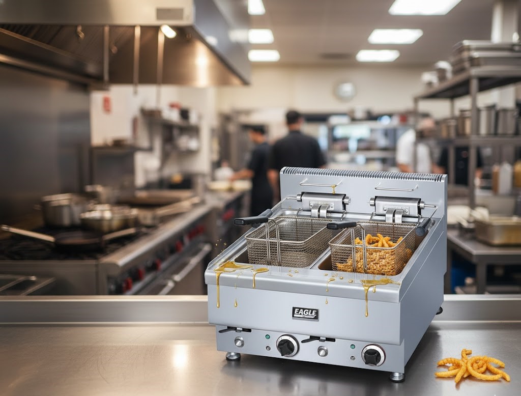 Vệ sinh bồn chiên sau mỗi ca làm việc để đảm bảo vệ sinh và tuổi thọ thiết bị.