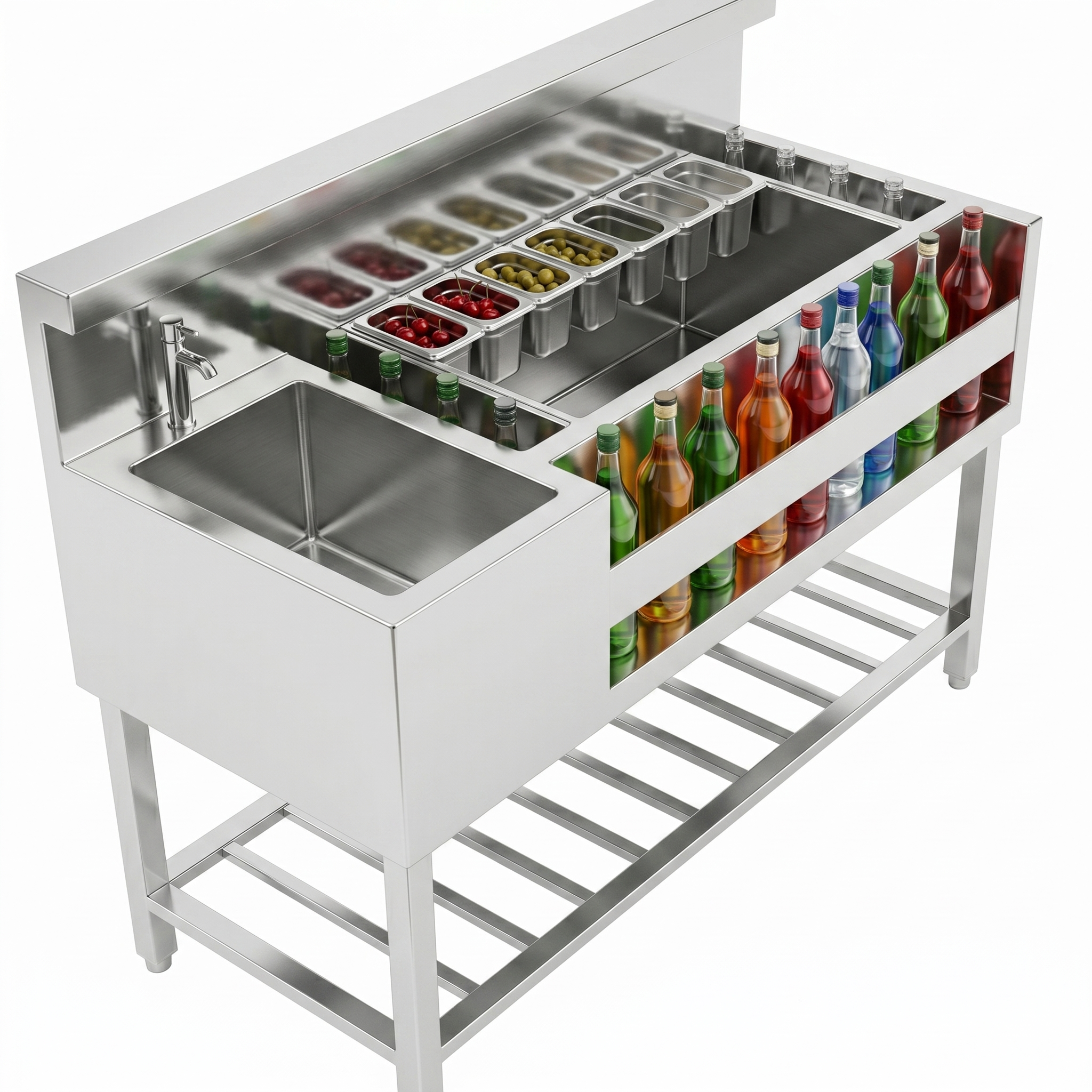 Công dụng: Lưu trữ đá viên phục vụ pha chế và cung cấp khu vực dọn rửa dụng cụ ngay tại quầy bar.