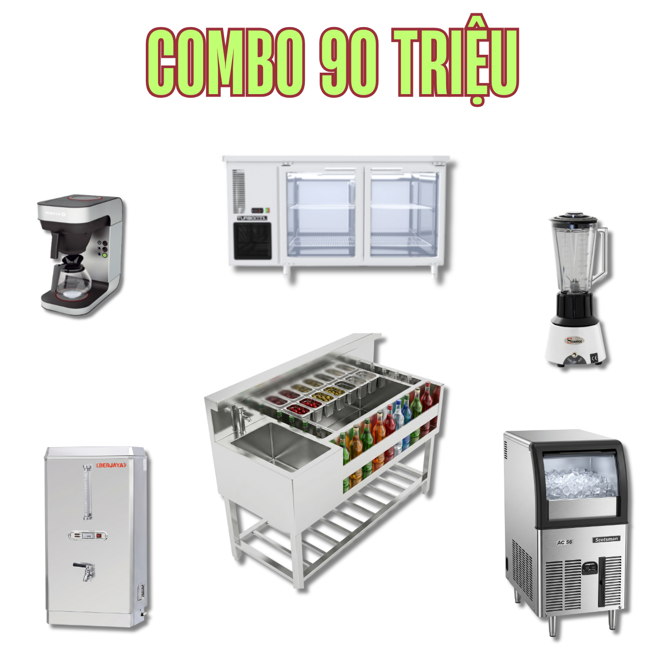 Combo thiết bị quầy pha chế mang đến giải pháp toàn diện và đẳng cấp nhất cho không gian quán cafe bar hoặc khu vực lounge chuyên nghiệp. Với tổng trị giá 90 triệu đồng bộ thiết bị bao gồm các sản phẩm chất lượng cao sau đây: