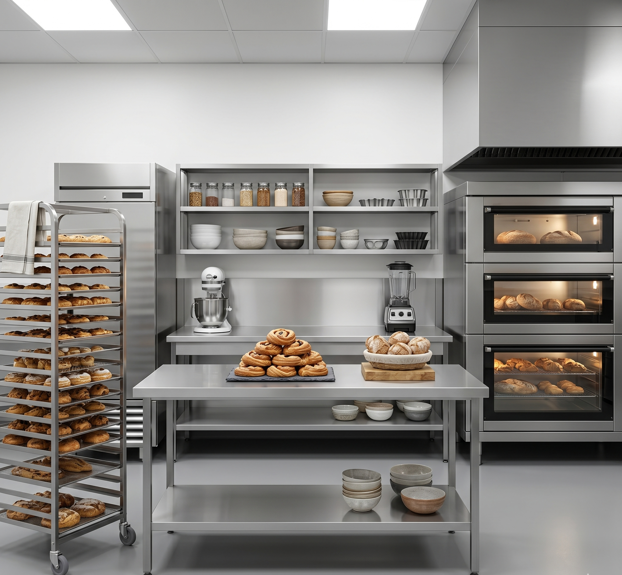 Đặc điểm: Trang bị hệ thống bàn inox mặt phẳng rộng giá kệ làm nguội bánh và khu vực trang trí bánh ngọt.